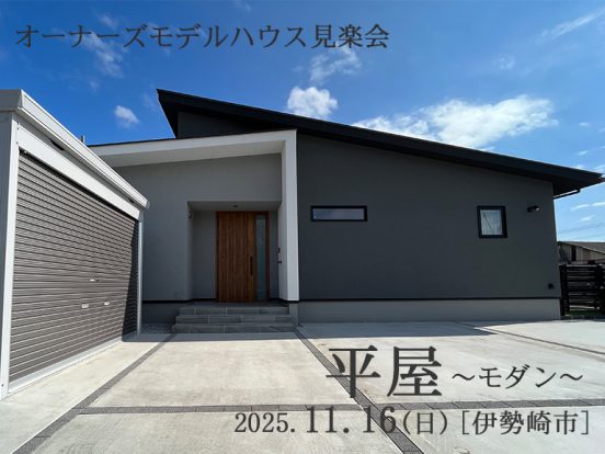 11月16日(日)伊勢崎市にて開催!平屋~モダン~ グレー塗り壁のモダンな外観、勾配天井と梁で魅せる素敵なお家。 家具や家電なども揃っていますので、より具体的なお家づくりのイメージが掴めます◎ ご入居...