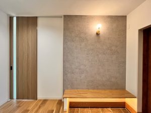 玄関を入ると、靴を履くのにちょうどいベンチ式カウンターが。