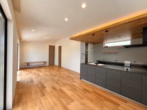 LDKは無垢単板張りのフローリングをチョイスさせて頂いたので、本物の木目が豊かな空間になっています。キッチンの天井も木目柄のクロスと間接照明を取り入れ素敵な空間に仕上がりました。