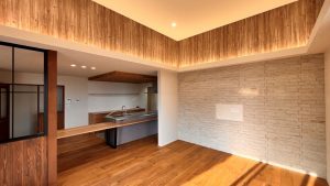 リビングは天井高を通常よりも上げ、一部壁に造作を加えてアッパー照明を取付させていただきました。壁造作の段差になっている部分より上は壁紙を貼り分け、木目の暖かさを感じられるように仕上げてあります。