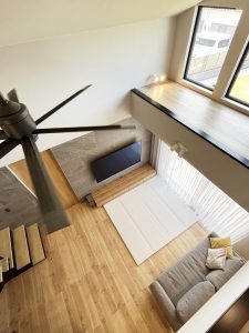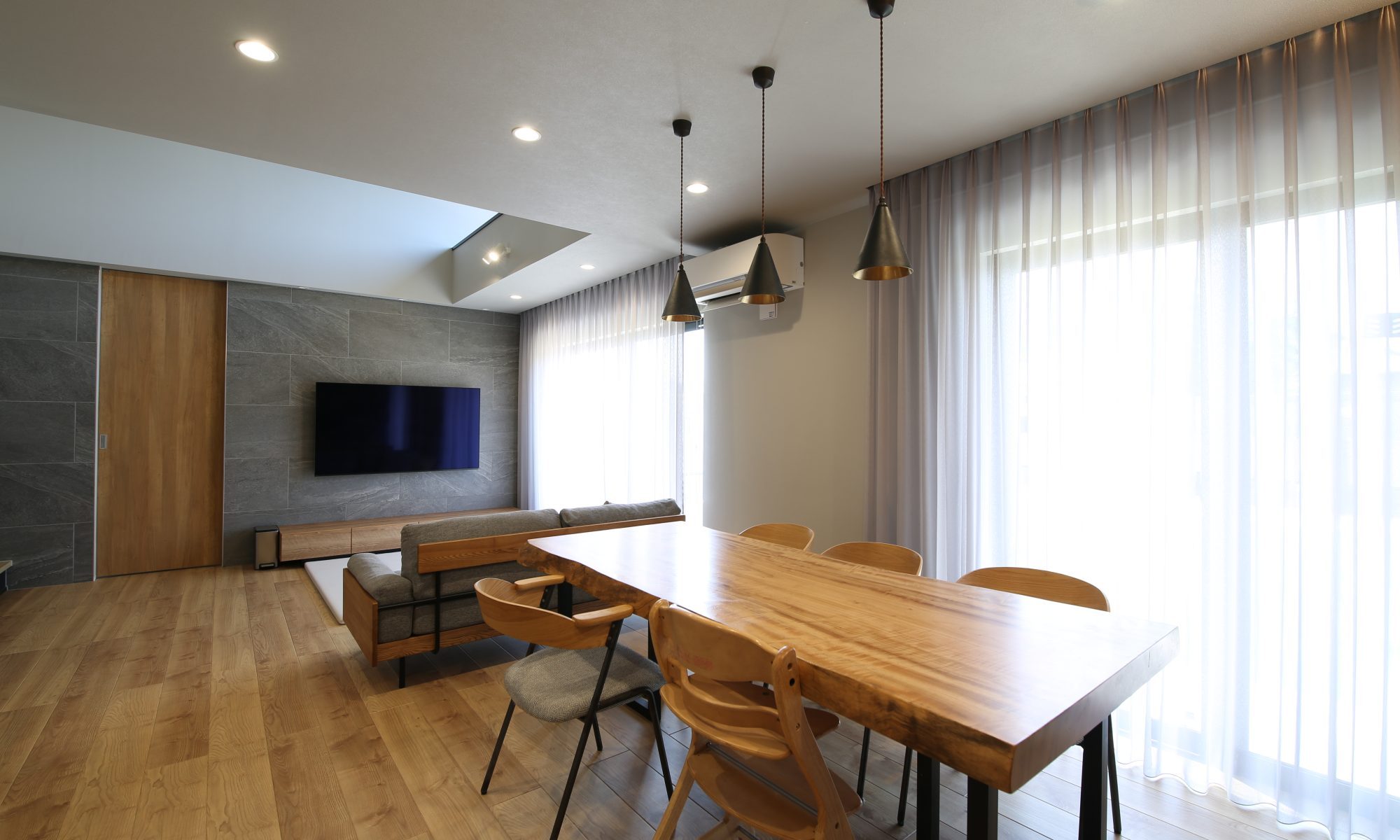 吹抜けリビングの圧倒的開放感に、モダングレーが映えるお家⌂