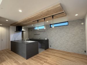 重厚感あるモダンなキッチンに、下がり天井の木目があたたかをプラスした