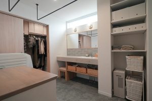 洗面所を中心とした、動線でウォークインとランドリースペース(右側)がある動