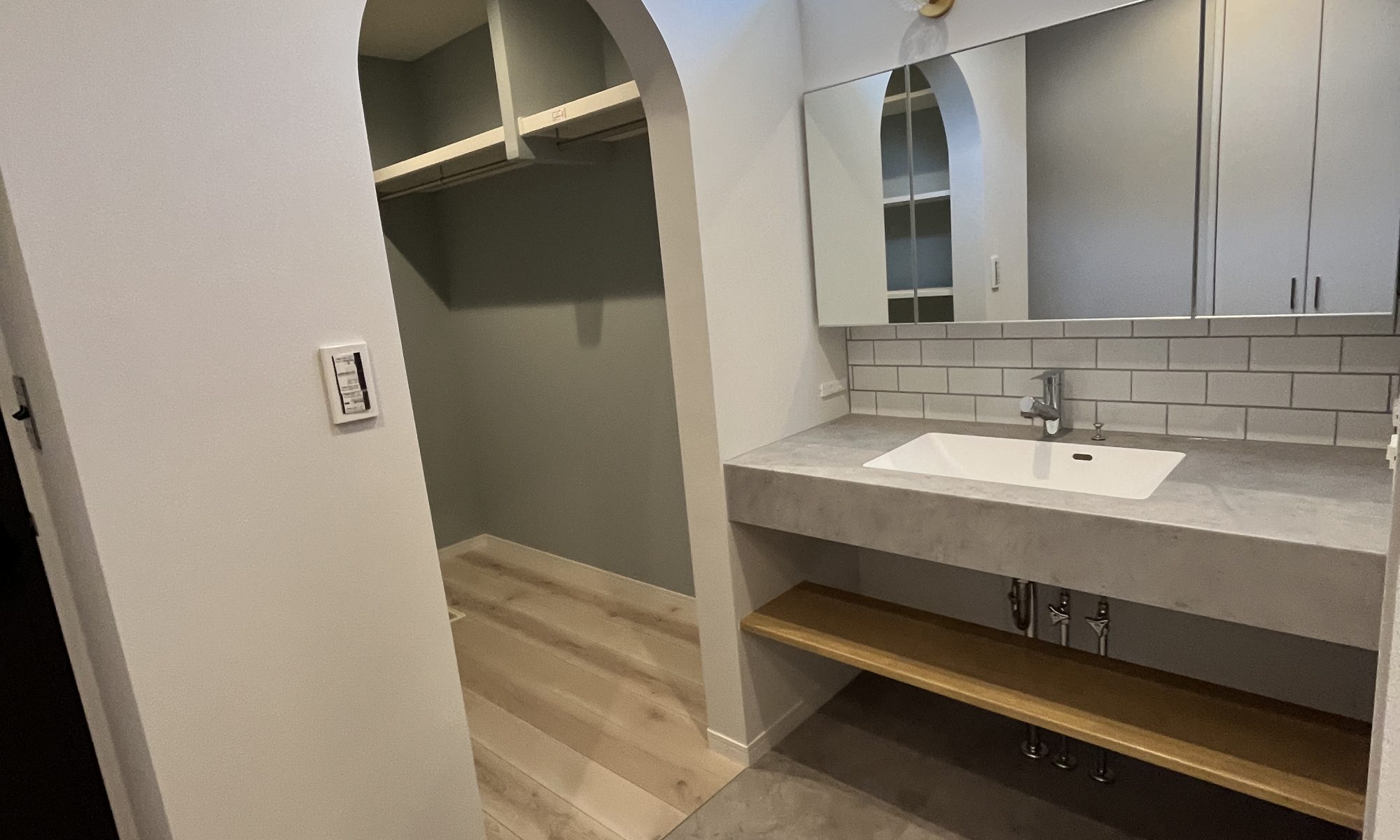 洗面所を中心とした、動線でウォークインとランドリースペース(右側)がある動