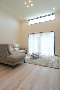 今回のLDKは長方形になっており、キッチン側の天井は下げ