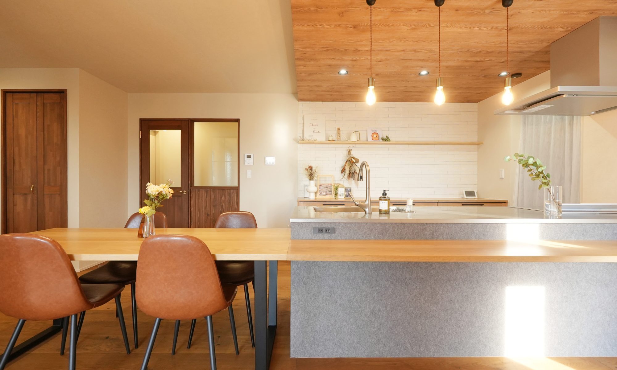 ~「素敵、快適、あなた的」なお家づくり。~ 群馬・栃木・埼玉県で本気注文住宅を お考えのお客様をサポートする「楽屋」のMAOです ✌ 本日は、キッチン下がり天井のご紹介です◎ アクセントでクロスを貼分ることで空間にメリハリも!! 人気の木目柄◎ 木目柄…