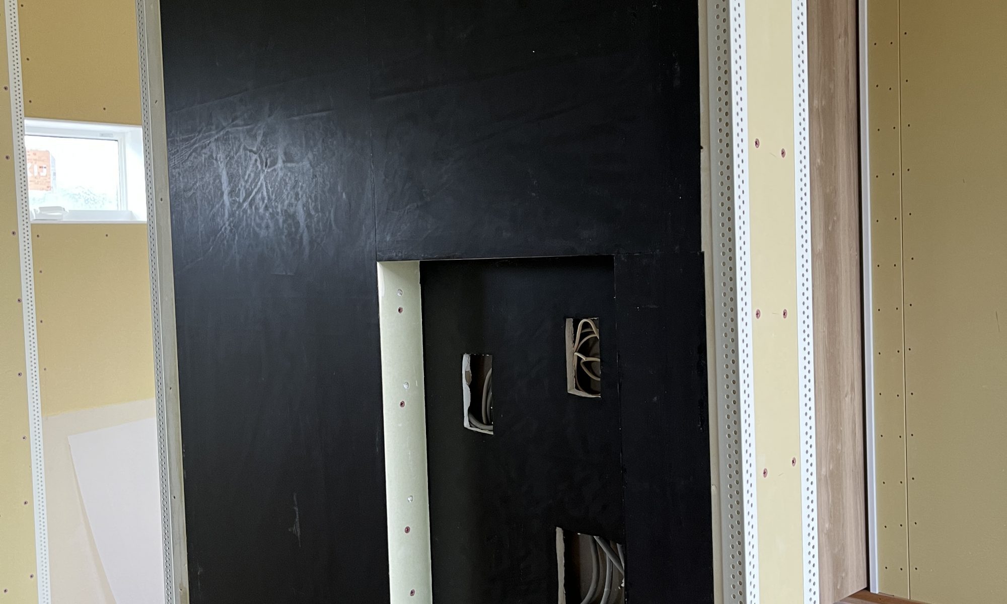 今日は、壁紙工事を行なっている、お家からお届け致します。 現在は壁紙を貼る前のパテ処理を行なっているところです。 一部の壁に黒いシートが貼られておりました!これは何でしょう? 正解は、マグマジックといって、磁石をくっつけられるものになります。 この上に仕上げの壁紙を貼っていきます…