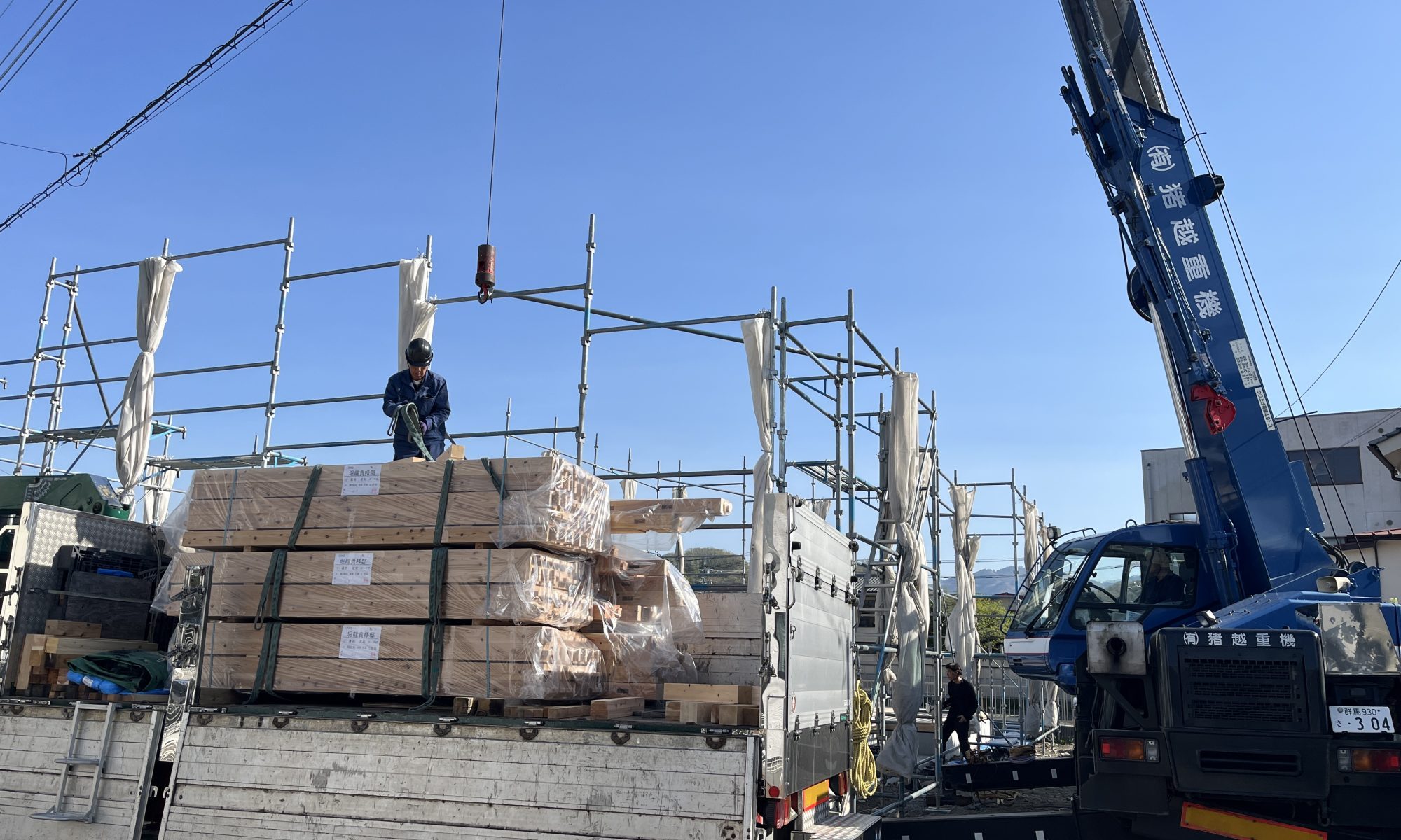 みなさんこんにちは楽屋です 今日は、県内某社にて上棟作業を 行なっております 構造材の加工を予め行なっている プレカット工場より運ばれてきた 材料をトラックから下ろして組立 ていきます。 あっという間に柱が建ちました。 今日4月9日は奈良の大仏の日だそう 東大寺にて天平勝宝4年4…