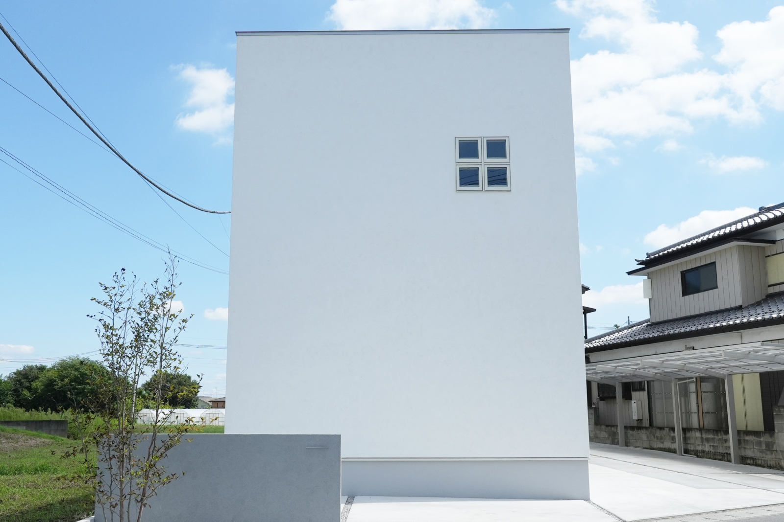 ホワイトの塗り壁に格子窓がかわいらしい外観◎